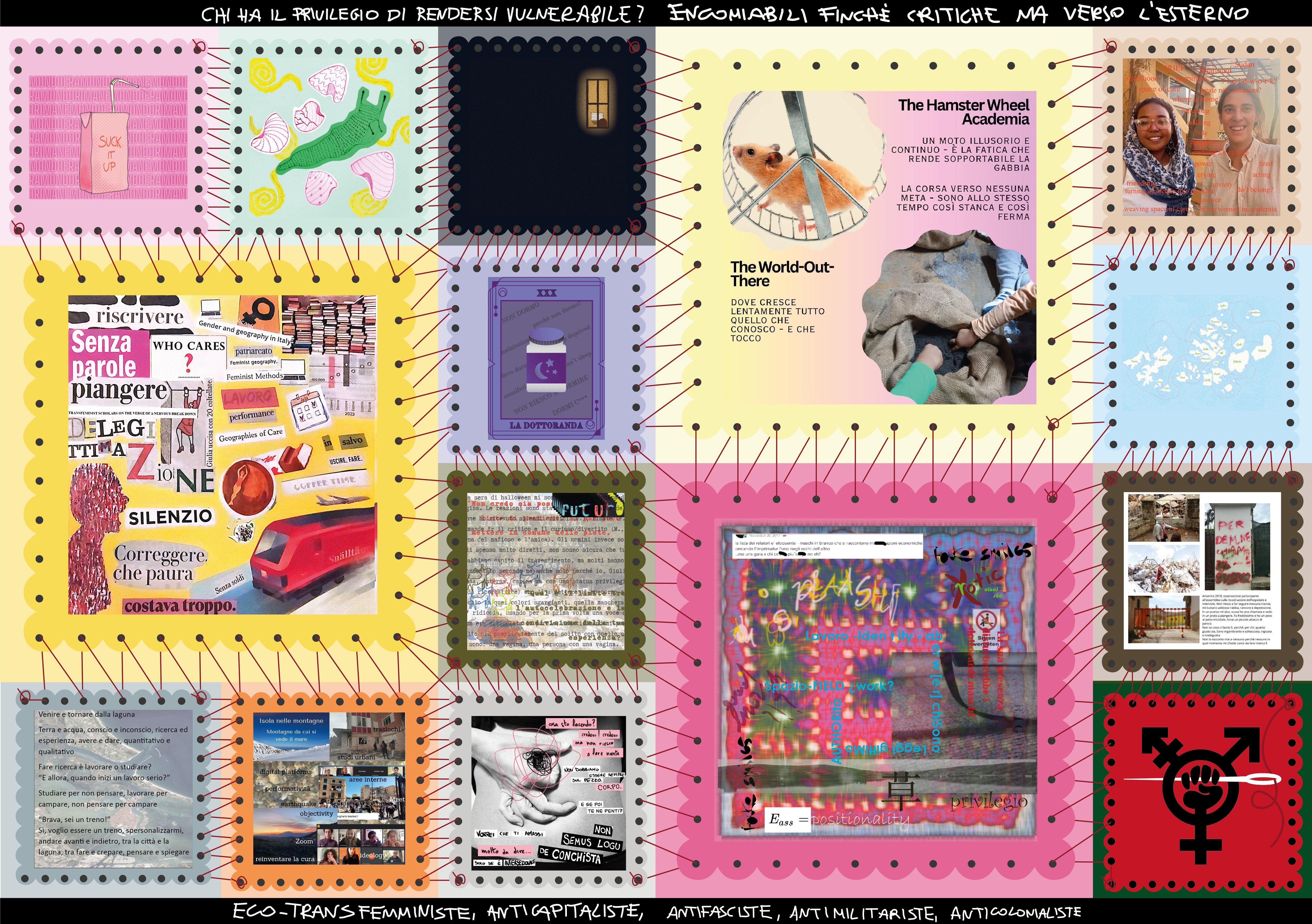 The paper presents a collective autoethnography of fourteen transfeminist scholars from diverse geographical backgrounds, exploring the experience of precarity within the Italian academic landscape. We have developed a supportive network, a virtual space where we could share our struggles in the competitive and isolating neoliberal academic system, away from its toxicity that often leaves us exhausted and burdened. Responding to the call from the transfeminist journal Lüvo for contributions on feminist and decolonial geographies, we engaged in a reflexive process that led us to imagine ourselves as islands within an archipelago, ultimately transforming into a patchwork blanket that is a metaphor for our solidarity and interconnectedness. We examine themes of loneliness, anxiety, and hypermobility, revealing how these experiences intersect with gender dynamics and academic hierarchies. Our work is about care and community, as we wove together our stories to challenge the neoliberal structures of academia. Through this collective work, we aim to illuminate the complexities of our experiences and foster alliances. We hope that others will join us in our struggle.