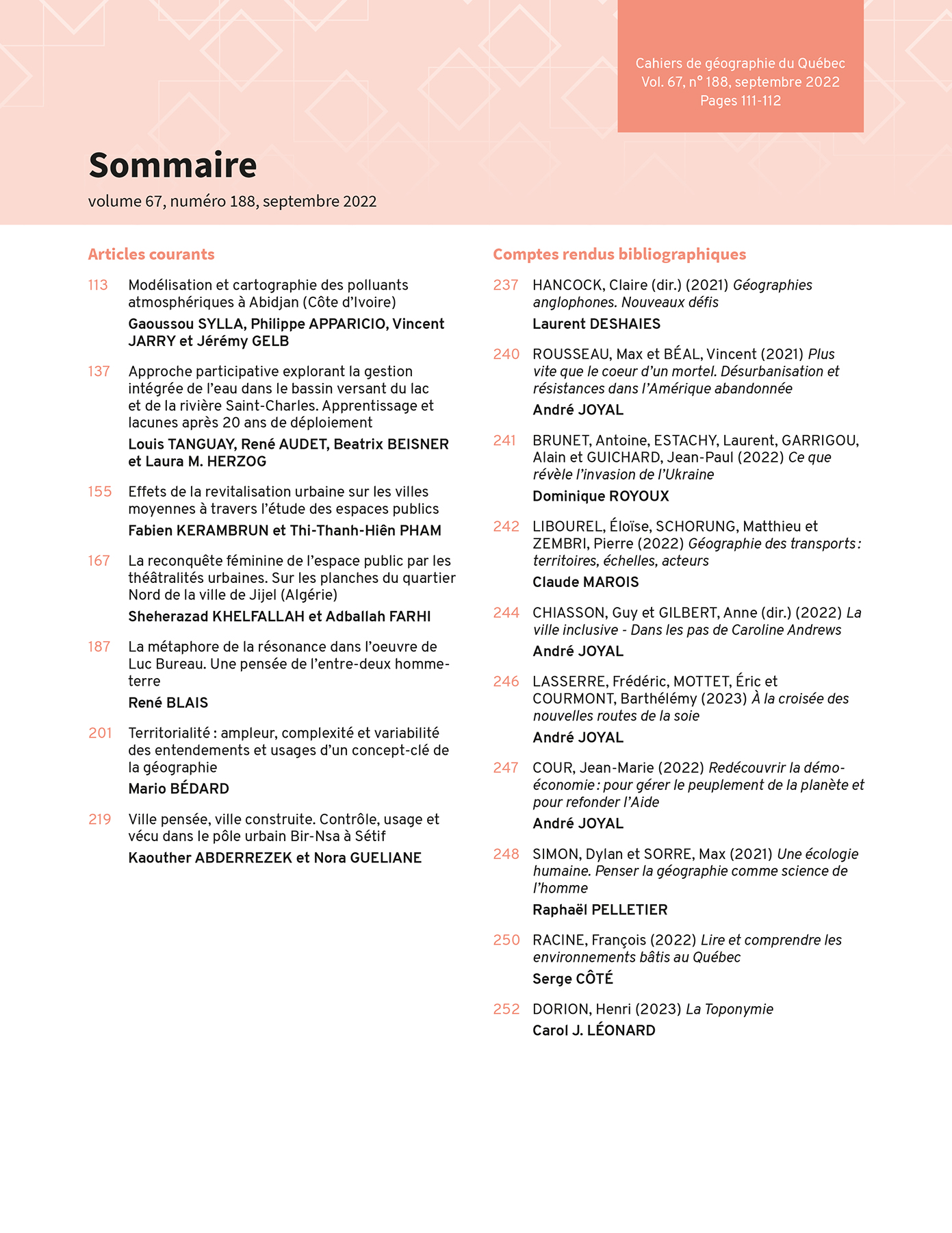 Published since 1956 by the geography department of Université Laval, Cahiers de géographie du Québec features articles on theoretical and applied research in the field of human geography. Open to all human geography themes, the journal also welcomes contributions by authors from other disciplines dealing with issues that concern territorial organization, e.g. urban studies, the organization of spaces and regional development. The publication places special emphasis on the practice of geography in Quebec and the rest of Canada.