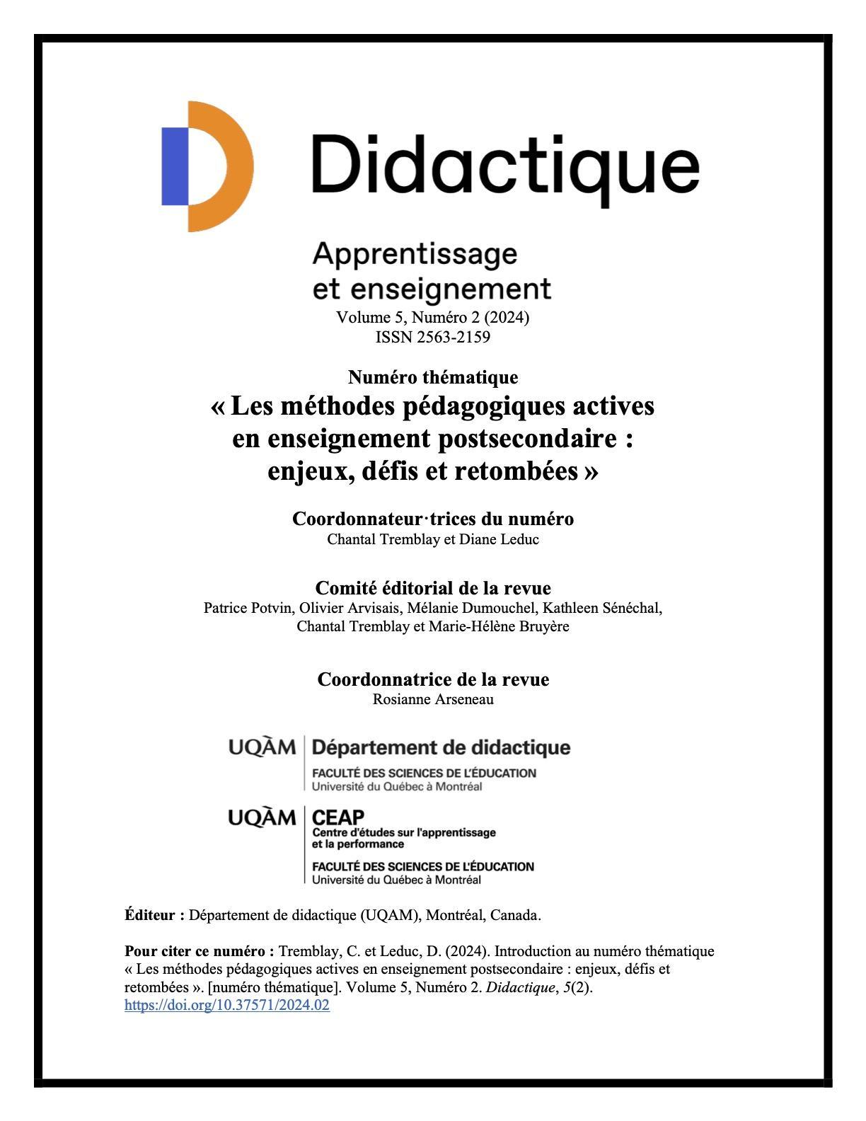Volume 5, Number 2, 2024 Les méthodes pédagogiques actives en enseignement postsecondaire : enjeux, défis et retombées Guest-edited by Chantal Tremblay and Diane Leduc