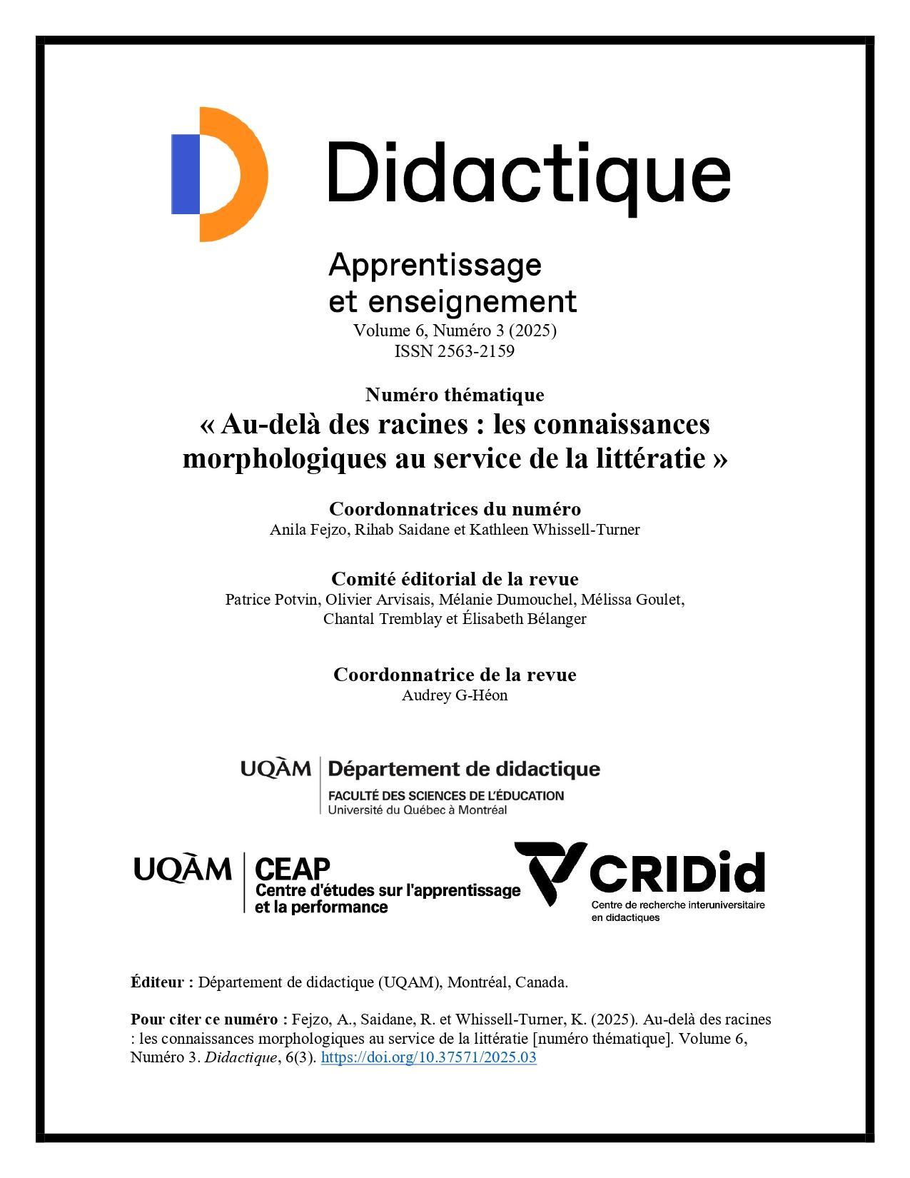 Volume 6, Number 3, 2025 Au-delà des racines : les connaissances morphologiques au service de la littératie Guest-edited by Anila Fejzo, Rihab Saidane and Kathleen Whissell-Turner