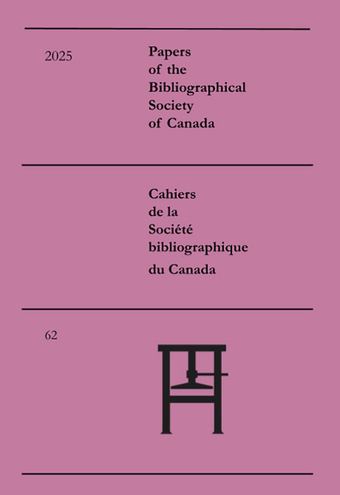 The purpose of the Papers of the Bibliographical Society of Canada is to publish original articles and notes in the field of bibliography and/or the history of the book, a field broadly construed to include printing and publishing history, studies of authorship, print culture studies, digital humanities, copyright history, the history of reading, textual studies, scholarly editing, library history, historical bibliography, descriptive/analytic bibliography, communications studies, media history, and any literary or historical research that takes particular account of the material forms of texts. The journal does not publish enumerative bibliographies (lists of publications on specialized topics). It is open to research on any time period or geographical region.