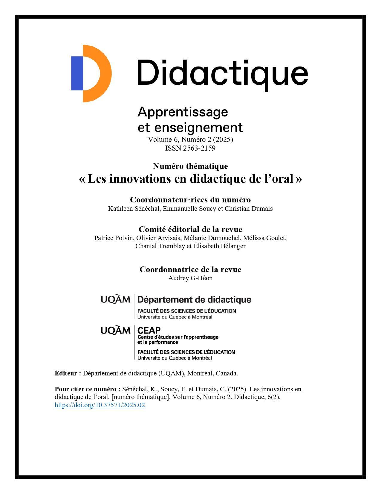 Volume 6, numéro 2, 2025 Les innovations en didactique de l’oral Sous la direction de Kathleen Sénéchal, Emmanuelle Soucy et Christian Dumais