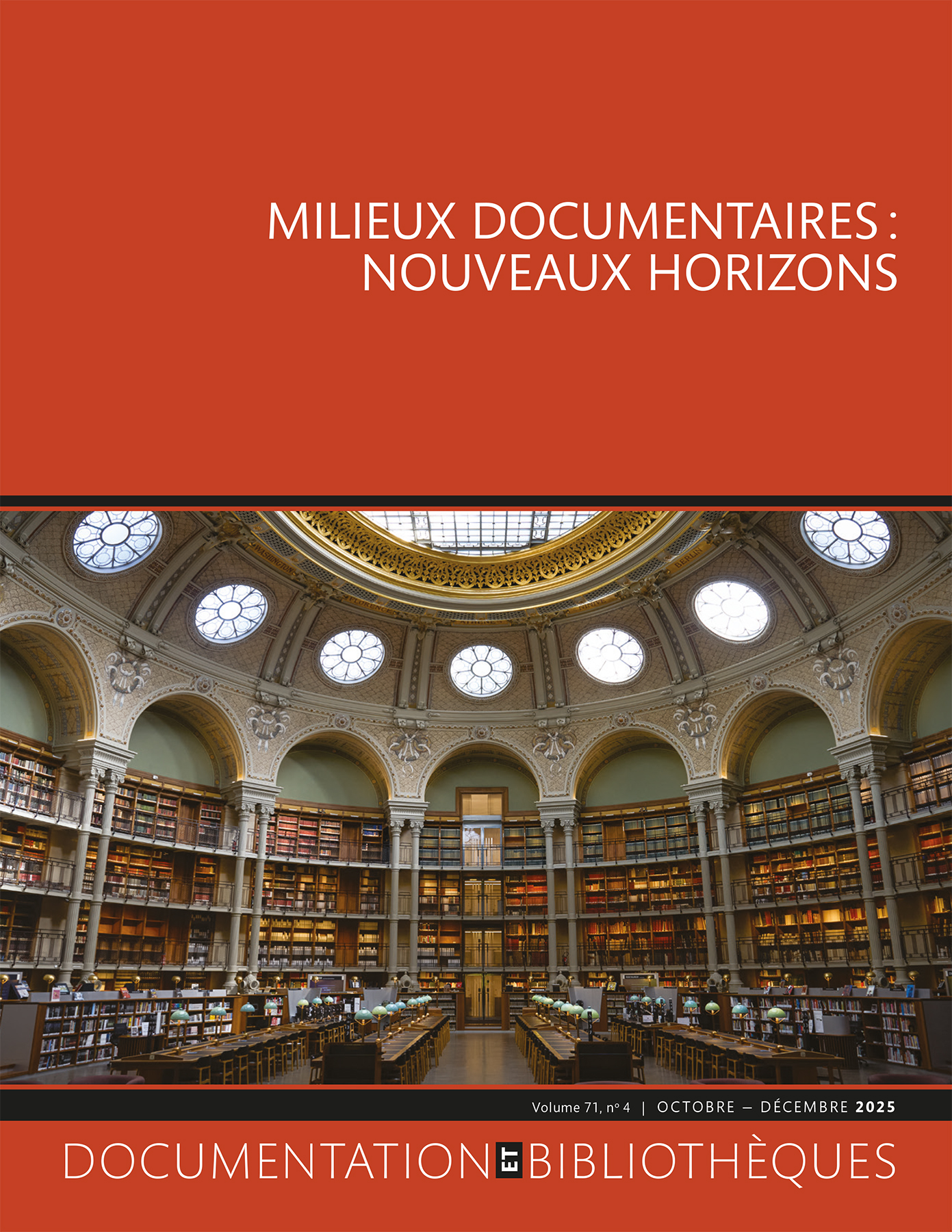 Documentation et bibliothèques publie des textes inédits en français sur tous les aspects reliés à la bibliothéconomie et aux sciences de l’information ainsi que sur des sujets connexes jugés d’intérêt pour son lectorat. La revue propose des articles sur les nouvelles réalités et les tendances actuelles dans les milieux documentaires, tant à l'échelle du Québec que de la francophonie. On peut y suivre l'évolution des problématiques et des questions relatives au monde de la documentation et de l'information à la fois sur les plans pratique et théorique.