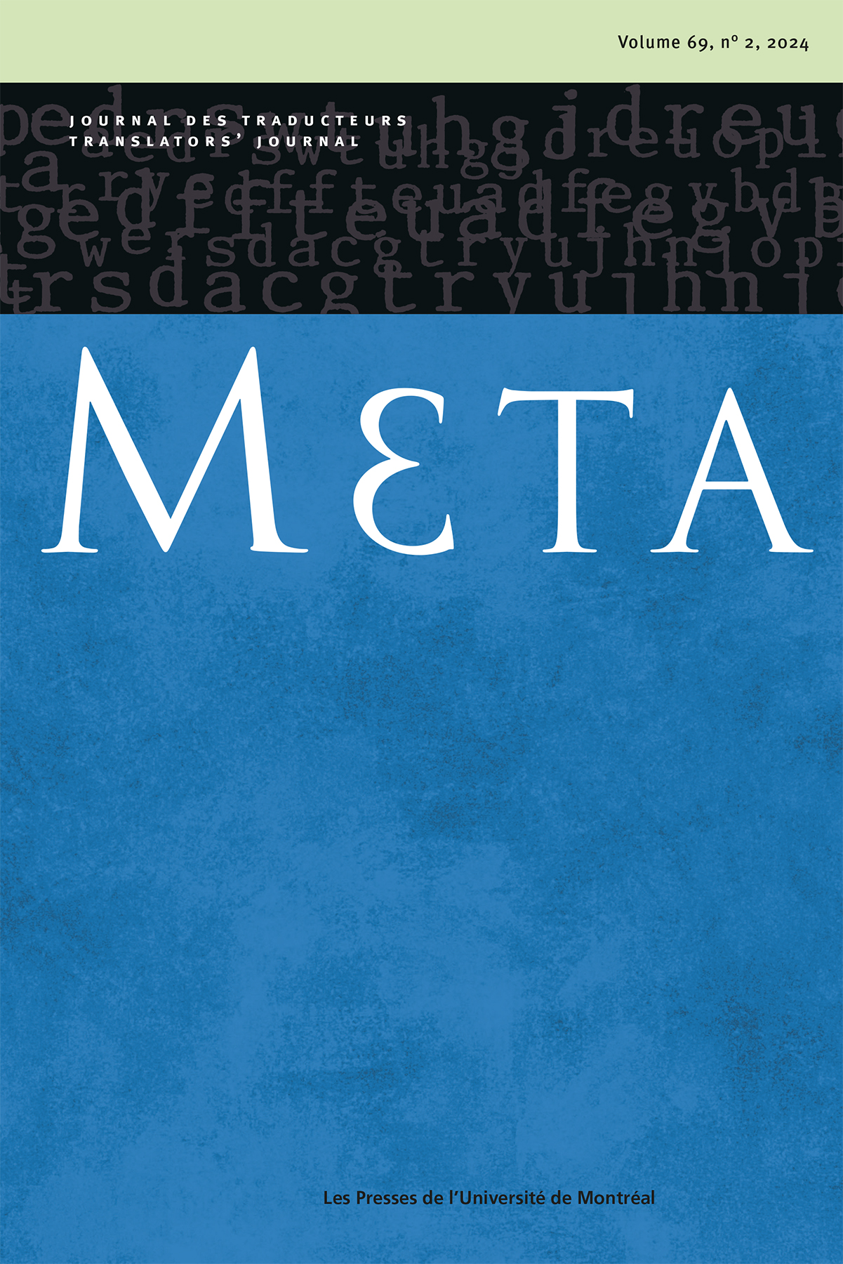 Meta : journal des traducteurs / Meta: Translators’ Journal est une revue savante internationale qui publie des articles de recherche en traduction, en terminologie et en interprétation. La revue publie deux numéros réguliers et un numéro spécial par volume, à raison de dix à douze articles par numéro. Trois langues sont acceptées, soit le français, l’anglais et l’espagnol. Dans certains numéros spéciaux consacrés à des langues-cultures particulières, d’autres langues, telles que l’allemand et le turc, ont également déjà été acceptées. Meta s’adresse plus particulièrement aux chercheurs et chercheuses, mais aussi à tous ceux et celles qui s’intéressent aux phénomènes langagiers mis en jeu dans la communication interculturelle.