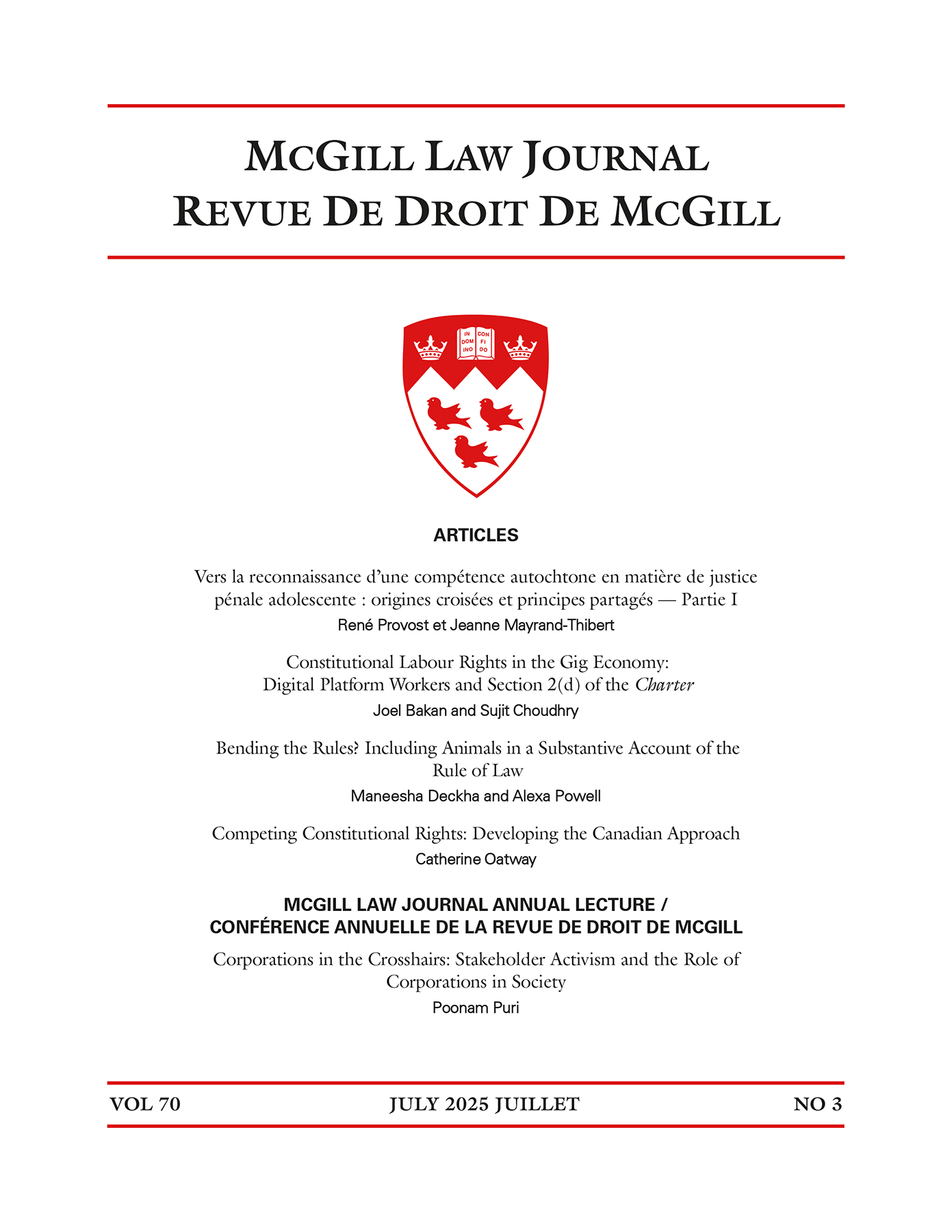 La McGill Law Journal / Revue de droit de McGill fut fondée en 1952 par des étudiants de la Faculté de droit de l’Université McGill. Soixante ans plus tard, elle continue d’être entièrement administrée par des membres du corps étudiant et les textes qui y sont publiés sont révisés par des pairs. La Revue se distingue par son caractère généraliste, bilingue, bijuridique, multidisciplinaire et transsystémique, et ses publications sont évalusées suivant un robuste processus de révision par les pairs. Si elle se concentre sur le contexte juridique canadien, la Revue recherche une perspective internationale et favorise une approche théorique du droit civil et de la common law. Toutes ces caractéristiques font de la Revue une publication renommée et respectée. Aujourd’hui, elle est reconnue comme étant un forum important pour l’analyse critique d’enjeux juridiques contemporains, que ce soit en droit public, en droit privé ou en droit international, et elle est d'ailleurs reconnue comme étant l’une des publications les plus citées par la Cour suprême du Canada.