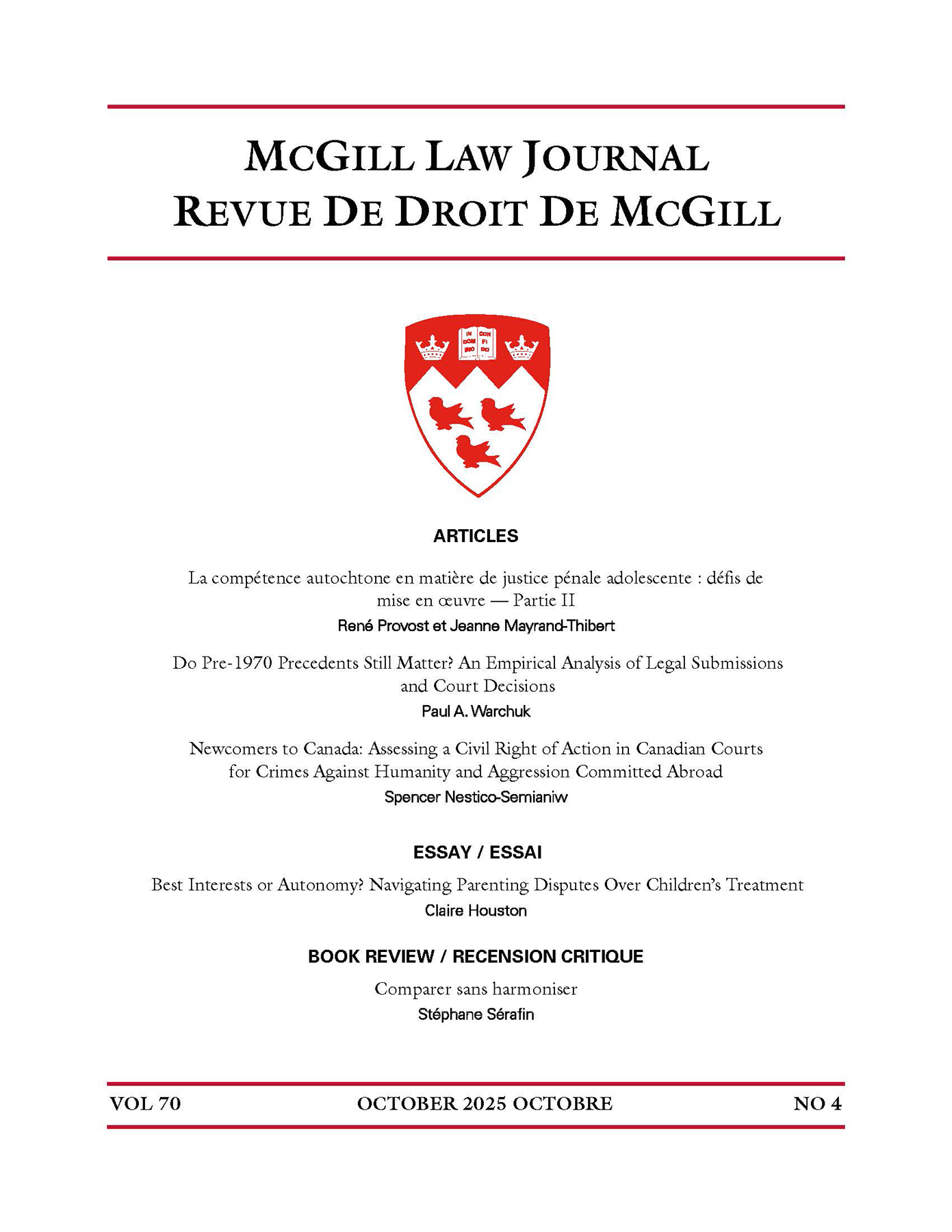 Cet article examine la pertinence actuelle des décisions rendues par la Cour suprême du Canada avant 1970 au moyen d’une analyse quantitative des citations. Il répond ainsi à l’affirmation du juge en chef Wagner, formulée en 2024, selon laquelle ces décisions historiques ne présenteraient qu’un intérêt juridique minime. L’étude s’appuie sur trois ensembles de données : les citations au sein des décisions de la Cour suprême (1985–2024), les mémoires d’appel (2009–2024) et les décisions de l’ensemble des cours et tribunaux canadiens répertoriés sur CanLII. Les résultats de l’étude infirment les propos du juge en chef. Les arrêts antérieurs à 1970 figurent dans plus de la moitié des décisions de la Cour suprême et dans le quart des mémoires déposés entre 2015 et 2024, ce qui représente 2 100 arrêts distincts. L’analyse qualitative révèle que les avocats et les juges invoquent ces précédents principalement à titre d’autorité juridique contraignante (77,6 %) plutôt que comme simple contexte historique. Contrairement à l’idée reçue voulant que la jurisprudence plus ancienne soit devenue non-pertinente dans les affaires commerciales, ce domaine affiche paradoxalement le taux de citation le plus élevé pour les arrêts pré-1970. Fait étonnant, les mémoires rédigés en français citent plus fréquemment les décisions non traduites antérieures à 1970 que les mémoires en anglais, et le juge en chef Wagner lui-même figure parmi les juges les plus enclins à citer des arrêts historiques. L’article conclut que les décisions antérieures à 1970 continuent d’influencer de manière significative la jurisprudence canadienne, particulièrement dans certains domaines de droit, ce qui souligne l’utilité certaine que revêtirait leur traduction officielle.