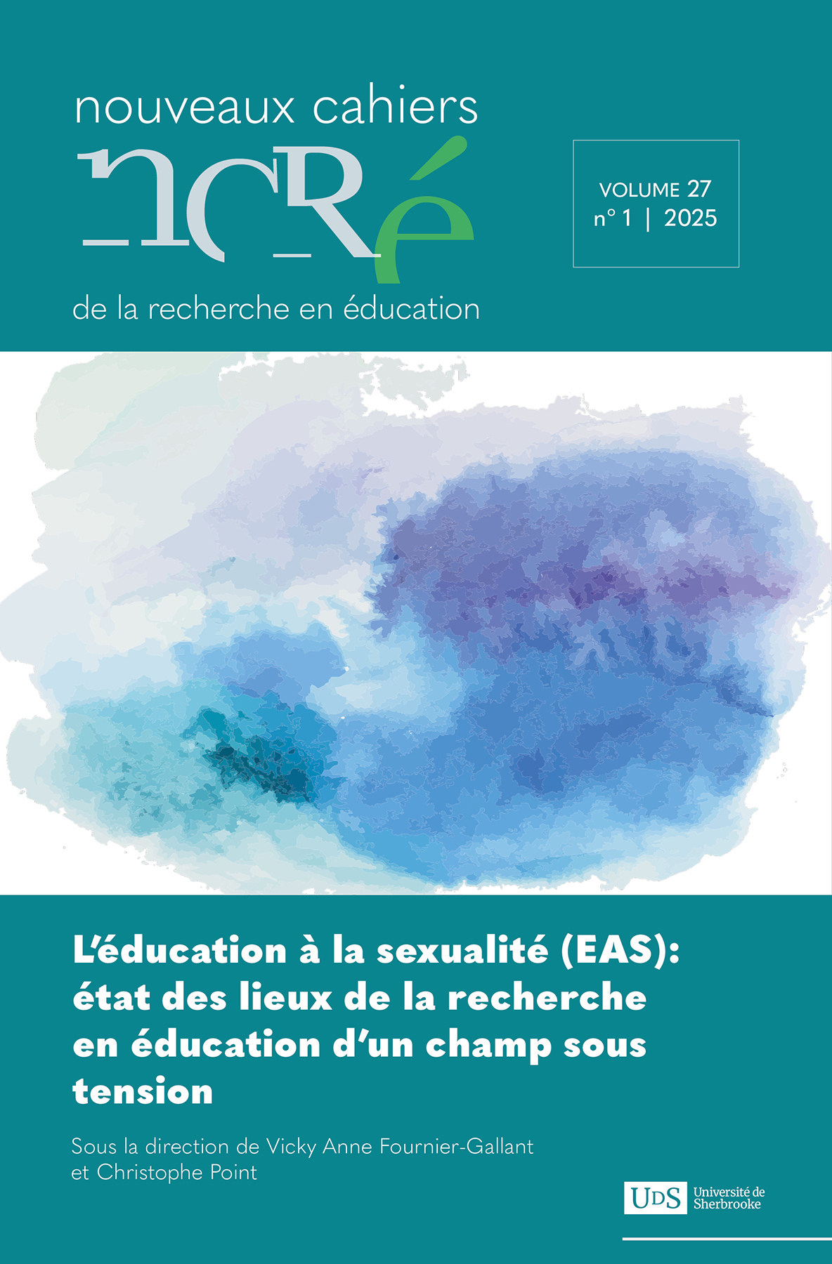 Volume 27, numéro 1, 2025 L’éducation à la sexualité (EAS) : état des lieux de la recherche en éducation d’un champ sous tension Sous la direction de Vicky Anne Fournier-Gallant et Christophe Point