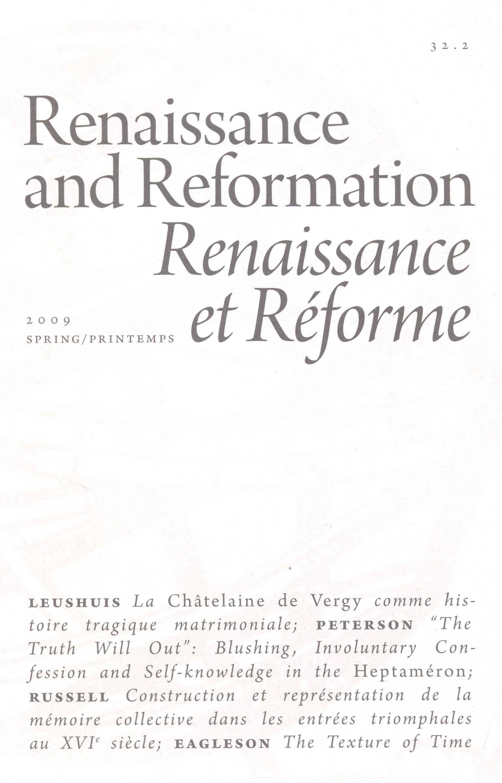The anonymous thirteenth-century poem La Châtelaine de Vergy, a courtly love story that ends in bloodshed after its central secret is divulged, was adapted as the 70th novella in Marguerite de Navarre’s Heptaméron (published 1558–1559). Matteo Bandello’s Italian adaptation of this version of the story (in his posthumously published Quarta parte delle novelle [1573]) introduces an important change by specifying that the lovers are now clandestinely married; this detail is retained in an anonymous French translation of Bandello’s reworking, which appeared in one of the volumes of the popular Histoires tragiques. While critics have been puzzled at this apparent narrative flaw (marriage needs no secrecy), this essay argues that the shift is intentional by considering it in light of the problem of clandestine marriages and post-Tridentine matrimonial reform. While Marguerite’s novella already recasts the Châtelaine de Vergy story in matrimonial terms, Bandello further exploits its drama of speech, in which tragic events are triggered through speaking and divulging secrets, to question the Church tradition of contracting matrimony merely by the partners’ spoken words. A number of textual ambiguities in the French translation reveal furthermore that the story has subsequently been re-interpreted from a new perspective on betrothal as a non-binding spoken promise that gained ground during the Counter-Reformation. The textual transformations introduced into these three versions, moreover, are examined in the context of the development of the “histoire tragique” as a literary genre during the second half of the sixteenth century. This study thus identifies a correlation between the characteristics of the “histoire tragique” and matrimony’s socio-historical dynamics.