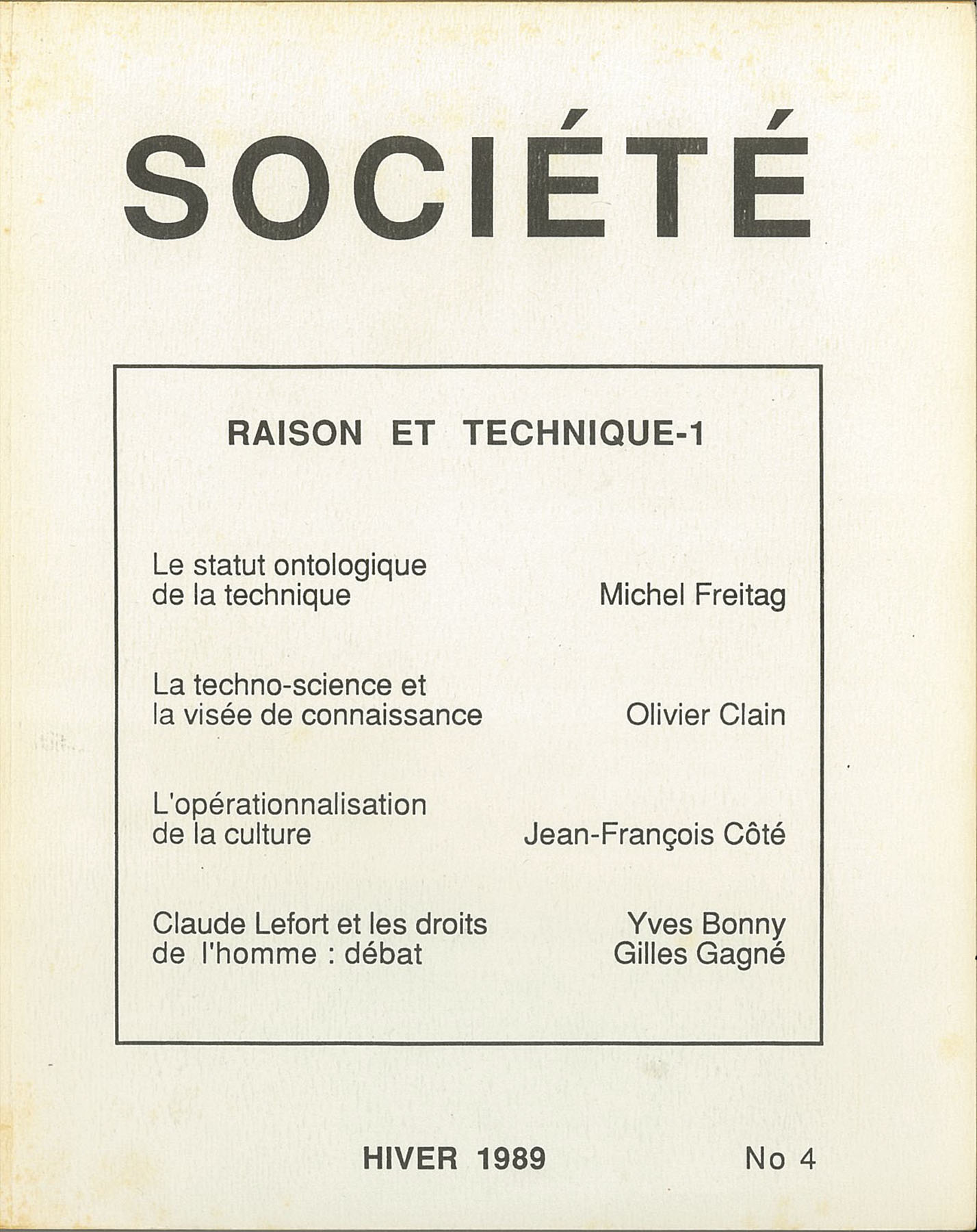 Numéro 4, hiver 1989 Raison et technique 1